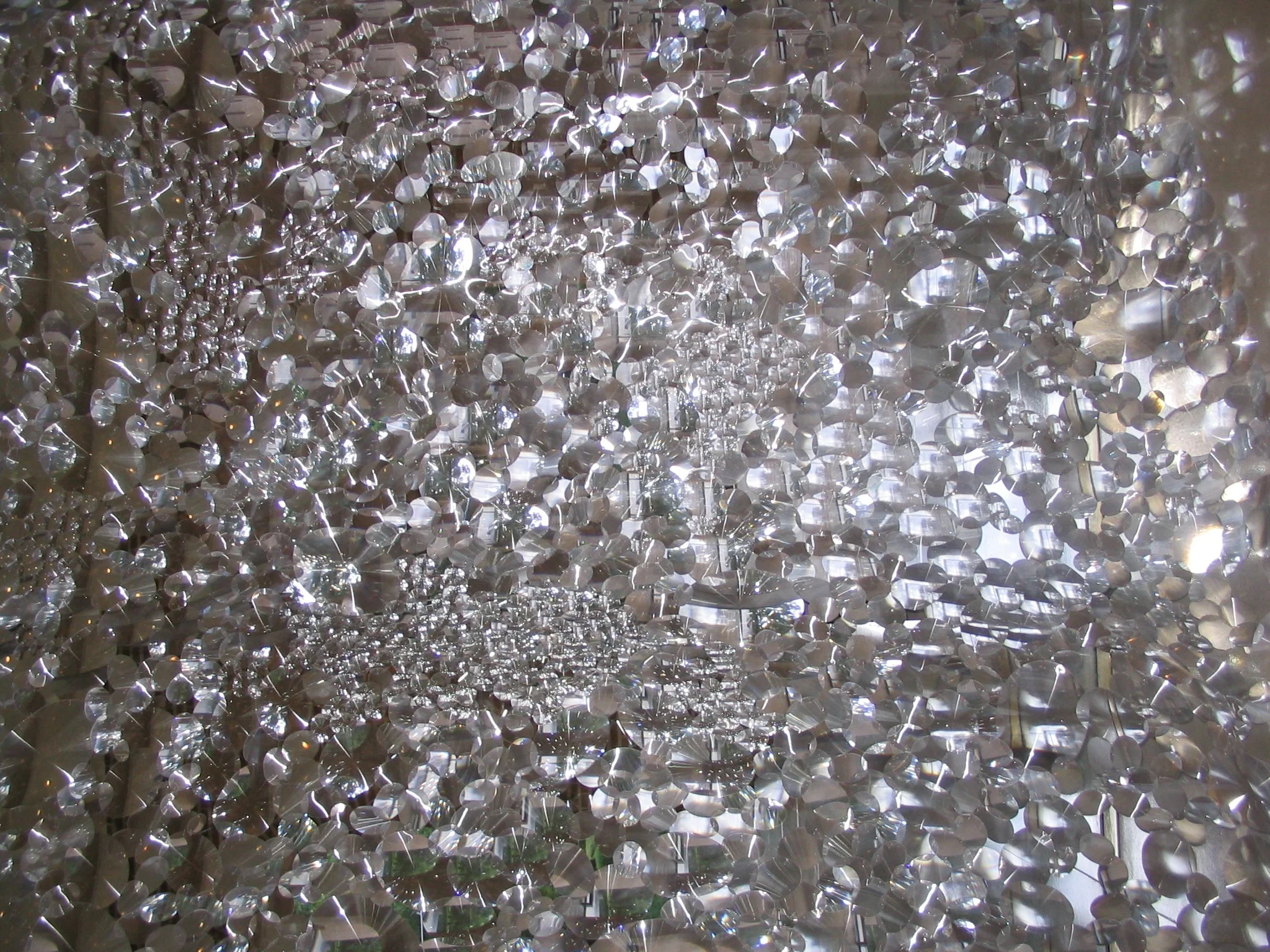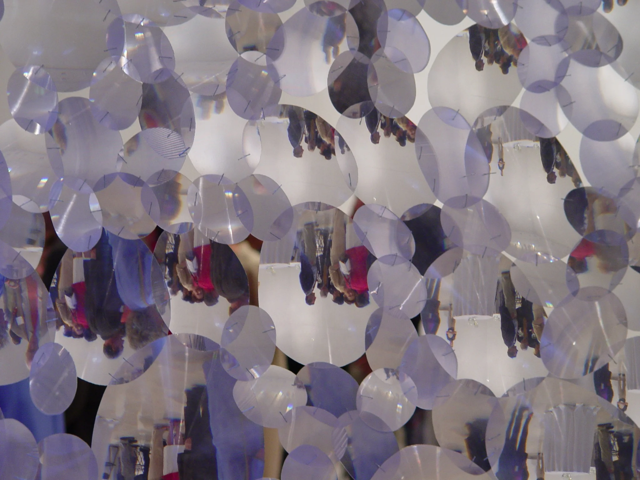 To create The Shape of Space, the artist and her assistants hand-cut more than 18,000 ovals from Fresnel Lens magnifying plastic. Named for its inventor, 18th century physicist Augustin Jean Fresnel (1788-1827), a Fresnel Lens is flat on one side, ridged on the other, and was first used to build lighthouse lenses. Shotz chose sheets of lightweight, flexible Fresnel Lens plastic that is sold in wallet and page-size format and is used to magnify text. Like the original lens, the plastic sheets are imprinted on one side with a series of concentric grooves that act like tiny prisms to bend and refract light. This innate structure, as well as the patterns Shotz formed when she stapled the ovals together - dense in some areas, sparse in others - create a curtain that dazzles the eye as it captures and magnifies thousands of images.
