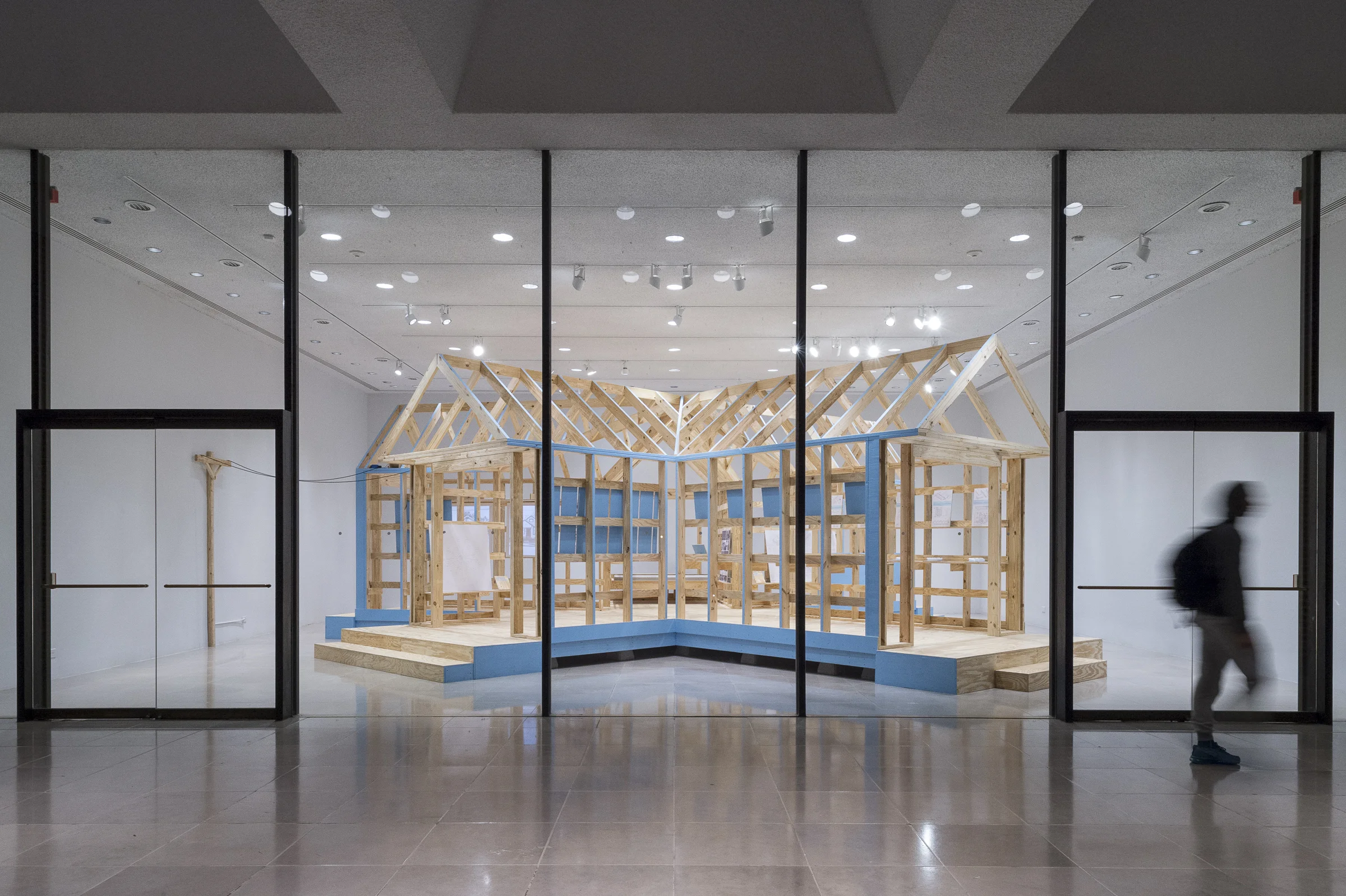 In SHOTGUN, five row houses merge into one another at the center of the gallery to create a space that visitors can enter and walk through. Nearly a 1:1 scale prototype of a distorted row house, each wing of the asterisk-shaped structure suggests a domestic space with seating and shelving that contains a different research project done by a student group. The last of these spaces features a selection of the students’ individual proposals that imagine new possibilities for the row house’s design and use. The installation’s distortion of the row house is a metaphor for a semester of work where the row house as a basic form was pulled apart to understand all its incarnations and uses. In the final installation, these threads of study are brought back together in a singular structure that is whole yet remains open and multi-faceted with multiple entry and exit points.