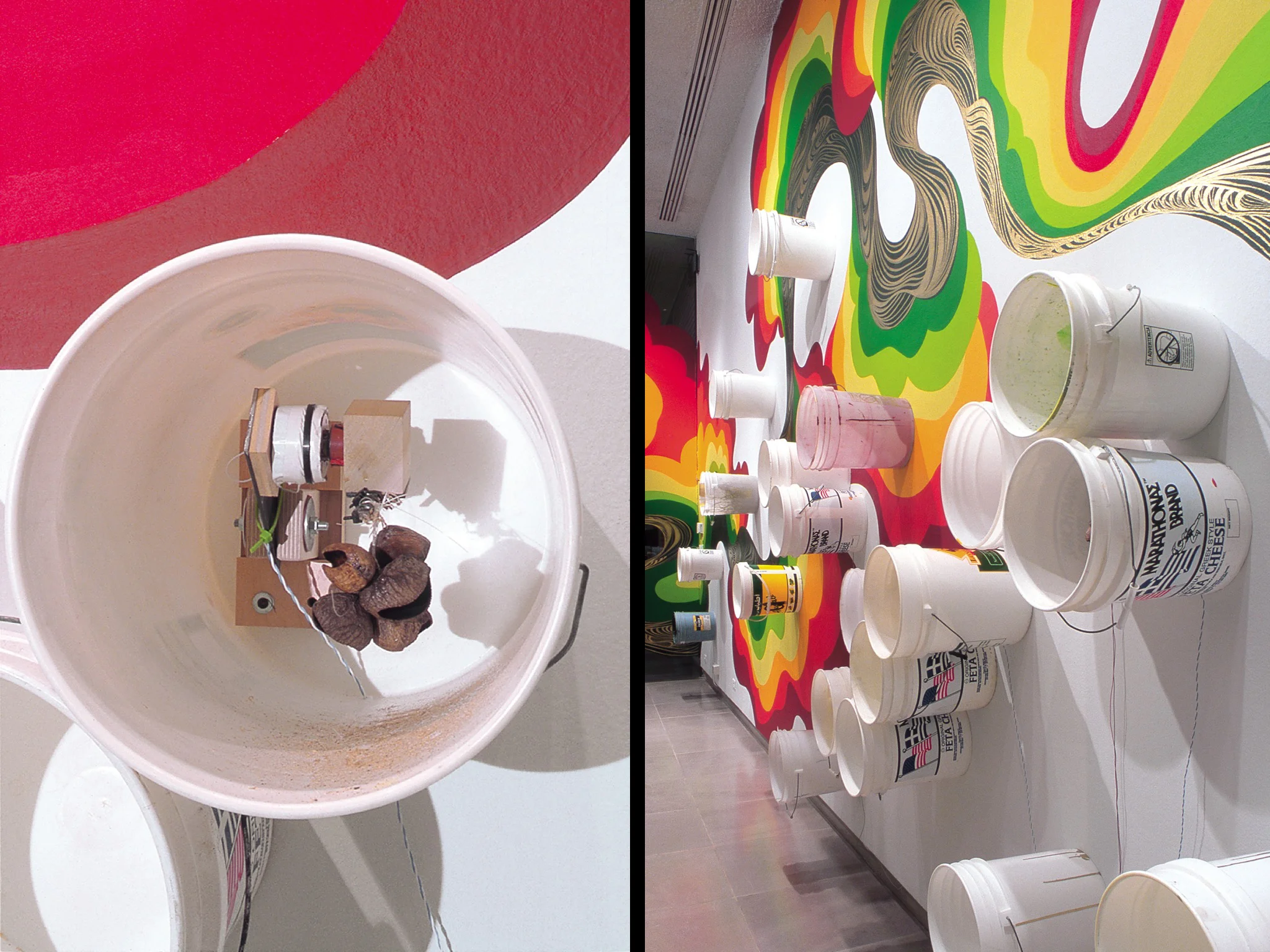 Bound, 2005, a video projection of a delivery truck he repainted every day for a week, and an example of a motion painting, is visible through peepholes in the left side-wall of the gallery.