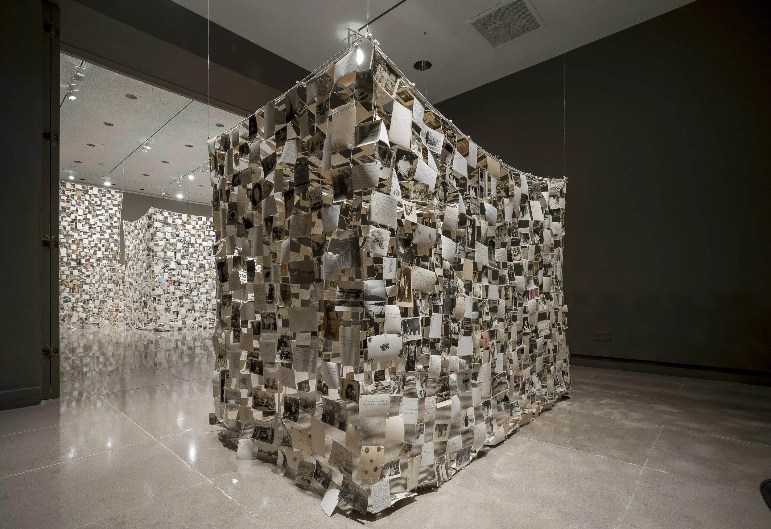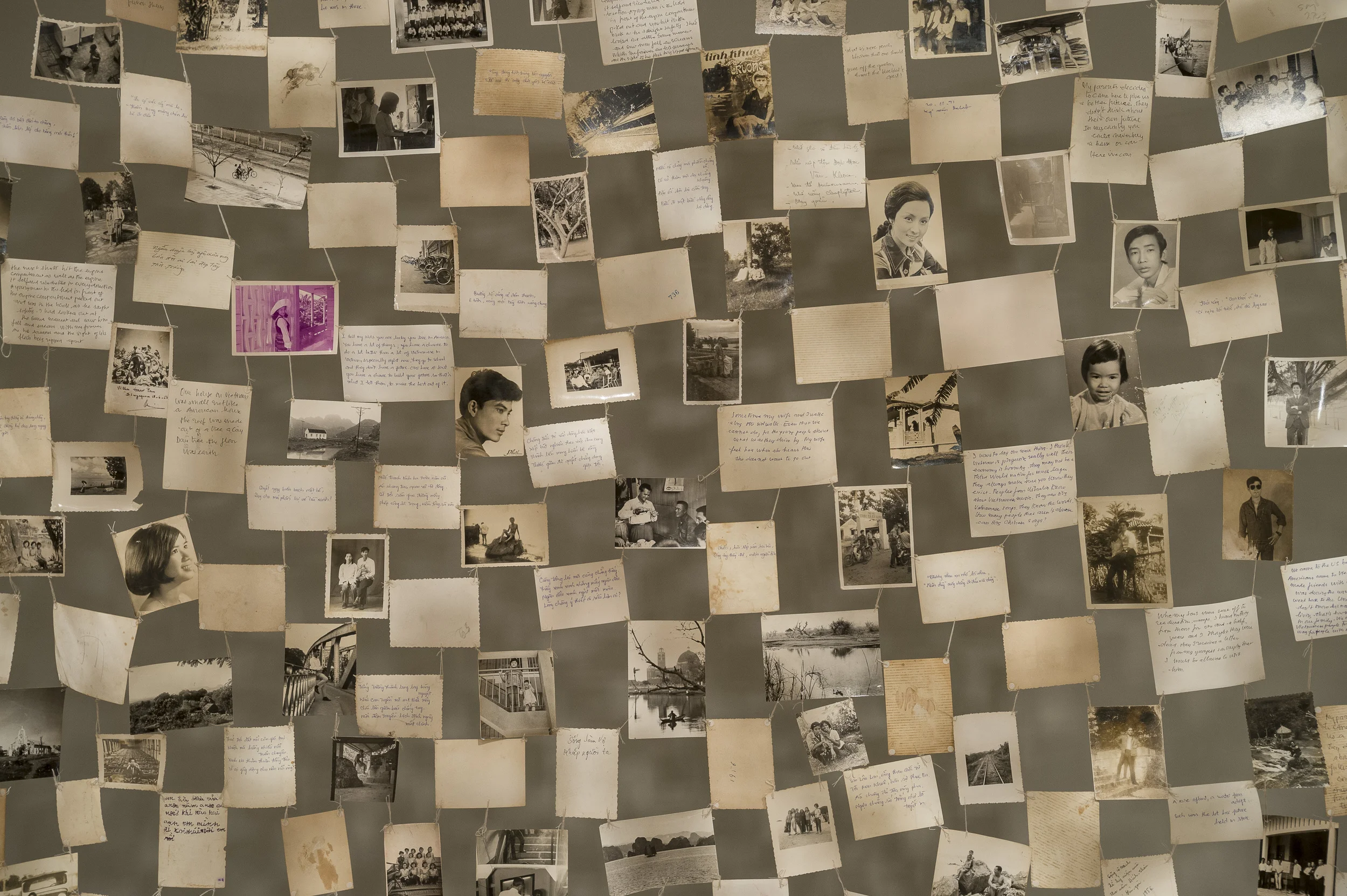 The photographs, some facing out and others turned inward, have been stitched together to form fragile-looking, rectangular structures. They allude to the mosquito netting under which people sleep, creating what Lê calls a “sleeping, dreaming memory of Vietnam.” He notes, “Most of these photos were taken because people want to remember special or happy moments in their lives. It is an extreme contrast to the photographs that the world saw of Vietnam during the Vietnam War.” On the visible backs of the photographs are handwritten texts that derive from a variety of sources including the epic poem, The Tale of Kieu, by Nguyên Du (1766-1820). The poem, considered to be the most significant work of Vietnamese literature, tells the story of Thúy Kiêu, a beautiful woman who sold herself into a loathsome marriage in order to save her family from ruin. After many trials and much suffering in far away places, she eventually makes it home and is reunited with her family. According to Dinh Q. Lê, it is a poem for which most Vietnamese people can recite the first four lines, and one with which many Vietnamese people who fled the country can identify. The handwritten texts also include snippets of recollections of Vietnam from interviews conducted by the Vietnamese-American Oral History Project that is housed on various university websites, and from a selection of nine interviews from the Houston Asian American Archives at Rice University’s Chao Center for Asian Studies.