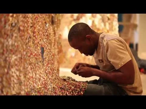 A native of Ghana and resident of Nigeria since 1975, El Anatsui has experimented throughout the years with a variety of media including wood, ceramics, and paint. Although Anatsui was a respected artist and teacher in Africa for more than thirty years, he was little known internationally until ten years ago when he began creating dazzling suspended sculptures made from liquor bottle tops and metal foil collars from the bottle necks. Driving in the countryside of southern Nigeria, Anatsui found a big bag of liquor bottle tops and collars apparently thrown away in the bush. Intrigued by simple and overlooked materials, or as he says, “whatever the environment throws up,” Anatsui took the bag back to his studio where it sat untouched for months as he continued to work on a series of abstract wooden sculptures. Eventually, he opened the bag and began experimenting with the contents - cutting, folding, and bending the metal bottle tops and collars into flat swatches of color and texture that he joined together with copper wire, forming massive shimmering curtains that subvert the stereotype of metal as a stiff, rigid medium. While New York Times art critic Michael Kimmelman called them, “great chain-mail tapestries,” the works’ glittering metallic surfaces and patterns also recall kente cloth, the emblematic fabric of Ghana. Anatsui’s father and brothers wove the kente of the Ewe people, and he speculates about the unconscious influence of family and cultural history upon him and this body of work.