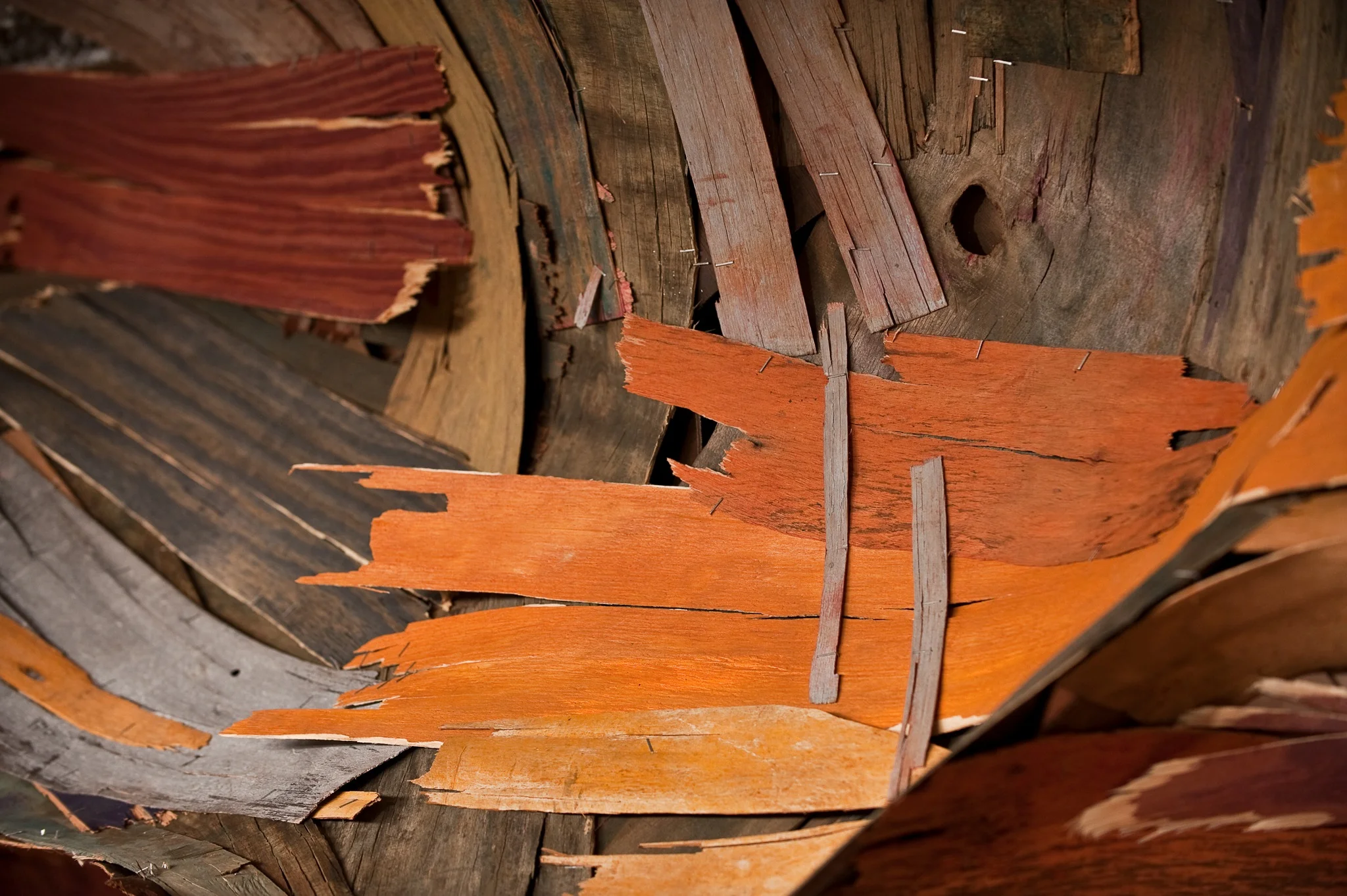 Oliveira uses tapumes, which in Portuguese can mean “fencing,” “boarding,” or “enclosure,” as a title for many of his large-scale installations. The term makes reference to the temporary wooden construction fences seen throughout the city of São Paulo where Oliveira lives. It also refers to the weathered wood Oliveira uses as the primary material in his installations. Early on, Oliveira experimented with the surfaces of his paintings by gluing newspaper onto a canvas and scraping it, or mixing sand with the paint. A breakthrough occurred while he was a student at the University of São Paulo, where for two years the view from his studio window was a wooden construction fence. Over time Oliveira began to see the deterioration of the wood and its separation into multiple layers and colors as similar to the process of painting. One week before the final student show opened, the construction was finished and the worn out plywood fence was discarded. Oliveira collected the wood and used it in his first installation.
