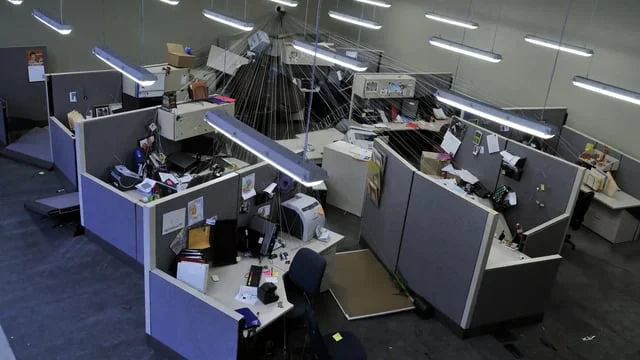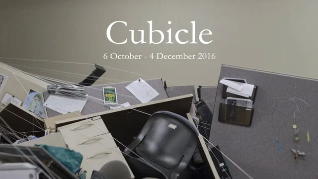 Walking by Rice Gallery and quickly glancing through its front glass wall, it might be easy to mistake it for a functioning office space. A grid of fluorescent lights hangs from the ceiling and cubicles line the perimeter of the gallery, surrounding a conference table and copy machine. Each workstation is full of the all-too-familiar trappings: boxy Dell computers, stacks of manila file folders, and personal ephemera pinned to cubicle walls, such as family photos and motivational messages. Far from the pristine, paperless ideal of the digital age, Rolodexes, adding machines, zip drives, and other dated technology litter the desktops. A dense web of cables interrupts the placid scene and is the first clue that this is not a normal workplace. The lines connect nearly every item in the office to a mechanical winch hidden behind a wall in the gallery’s back corner. The machine continuously pulls the objects and furniture at an extremely slow speed toward a small hole in the wall and eventual collapse.