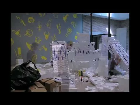 Salter incorporates another aspect of consumerism into his sculpture by re-using the molded Styrofoam used to pack electronics and other fragile items for shipping. This material which he notes is “difficult to recycle and unfriendly to the environment” becomes the building blocks for his monumental Styrobots. In too much, his installation at Rice Gallery, Salter will combine the Styrobot and his personal graphic icons in odd relationships of scale and placement. Says Salter, “In a lot of my work, there’s this kind of absurdly over-sized, bigger than life sculpture and at the same time, some very intimate experience. There’s something feverish, or off kilter when you’re observing something from twelve inches away and you back into a piece that’s looming over you.”