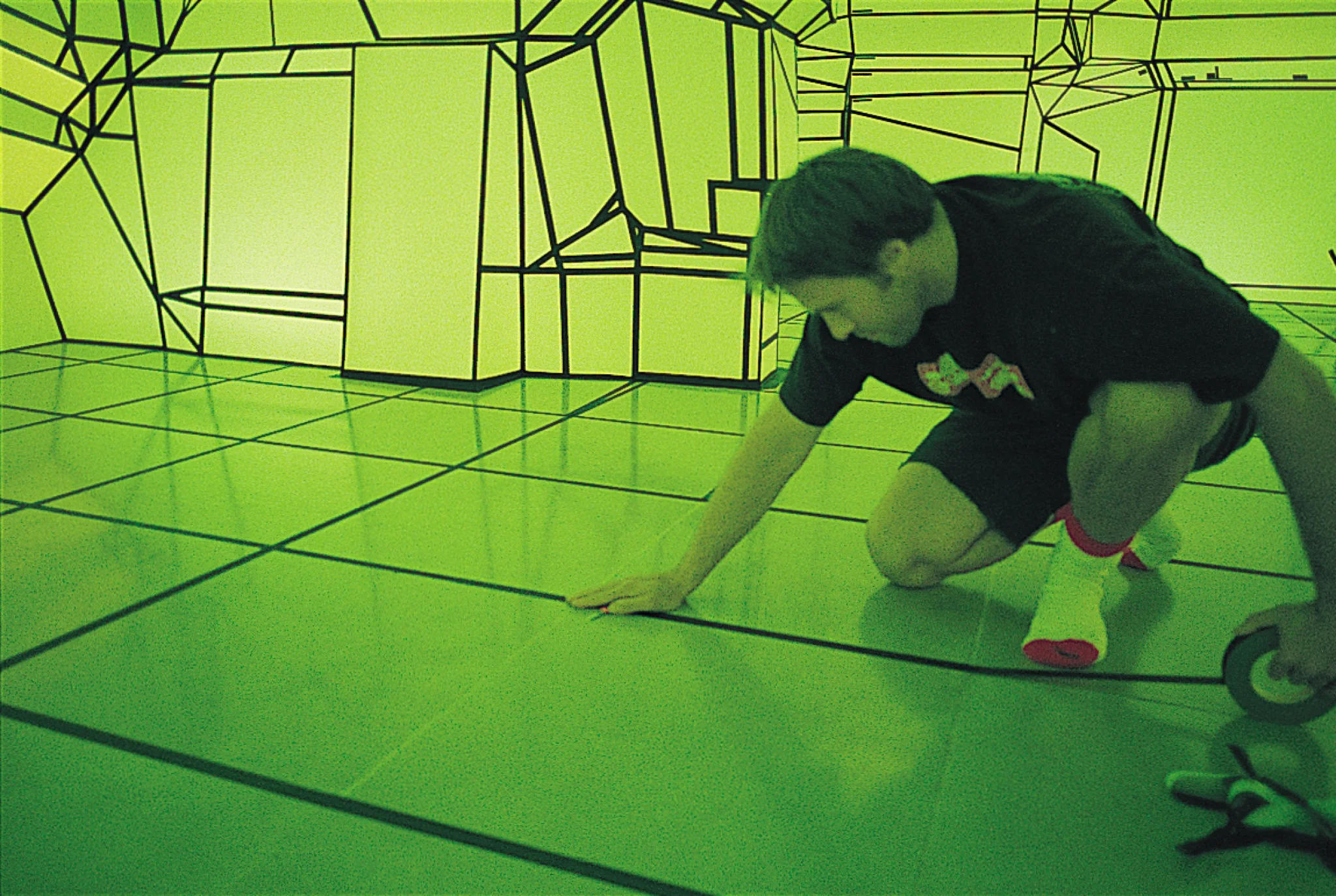 In contrast with this fast-paced world, Hendee employs a decidedly low-tech and laborious process to construct his sculptures. Unaided by a computer’s three-dimensional design capabilities, he decides on a general layout for a given space, then begins an arduous process of hand-cutting and assembling foam board components. Rather than follow a fully preconceived plan, he allows the structure to unfold, to grow and change. In Hendee’s words, “These spaces become an impression of dealing with them on a real-time basis, of filling geometry in a way that is not necessarily expeditious, but is certainly organic and spontaneous.” The real-time labor involved in makingSuperThrive was considerable; Hendee worked in the gallery, largely unassisted, for four weeks of fourteen hour days.