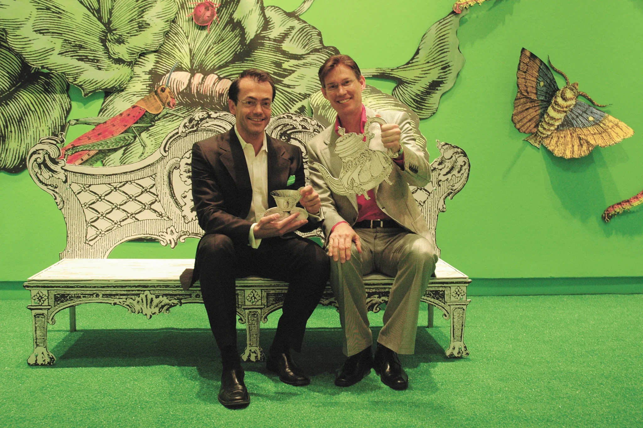 The White Webb partnership is known for its Intaglio Collection, whimsical furniture that uses collaged elements of antique engravings. The designers hyper-enlarge black and white reproductions of the engravings, silk-screen them onto fiberboard, then cut and assemble the pieces into furniture and accessories.